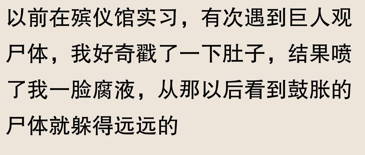 我一朋友在法医中心实习,第一次见巨人观尸体直接吐了。那尸体膨胀得像气球,皮肤发绿发亮,一碰就爆。后来他师父说最怕遇到巨人观,因为不仅恶臭难忍,解剖时内脏随时可能喷出来,而且腐败气体遇明火会爆炸。这哥们干了三个月就转行了,说宁可去扫厕所也不想再碰巨人观。