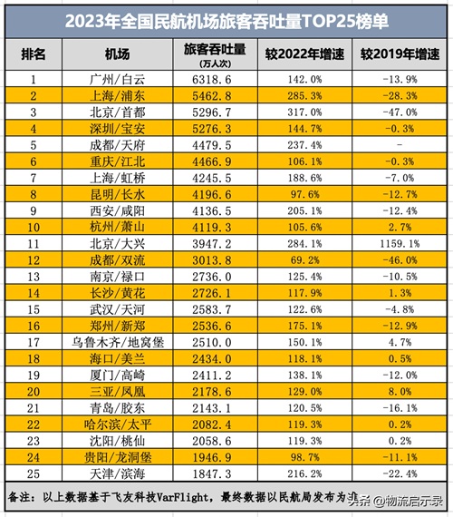 2023年全国机场客运量TOP25榜单,有10座机场恢复到疫情前水平!