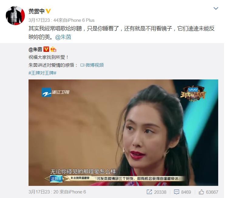 黄贯中昨晚贴出了节目的视频:「其实我经常唱歌给你听,只是你睡着了,还有就是不用看镜子,它们远远未能反映你的美。」高调的放闪,许多粉丝都大呼太man了,直呼老公力爆炸,太暖了~~许多人看到视频也非常感动,直呼朱茵嫁给了爱情、嫁给了黄贯中,非常幸福。