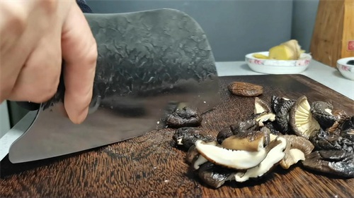 3:泡发好的干香菇,用刀切成小块。最好是使用干香菇,干香菇的香味更加浓郁。