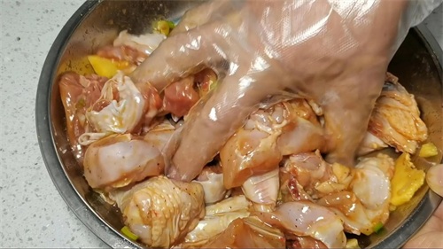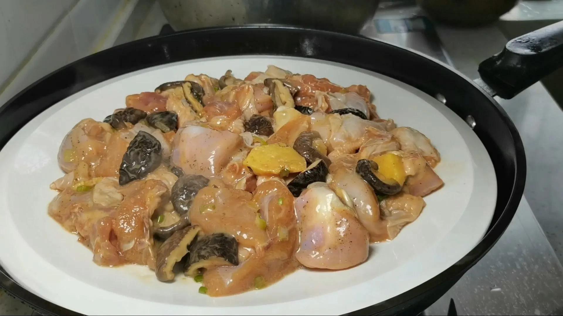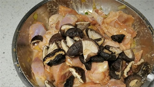 4:15分钟后,腌好的鸡块中加入淀粉抓拌均匀后,在放入香菇。