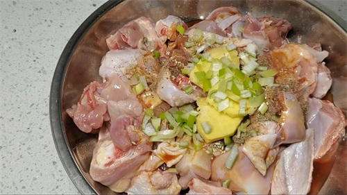 2:然后用生抽、蚝油、盐、胡椒粉、姜片、葱花、香油,放入鸡肉中抓匀,腌15分钟。