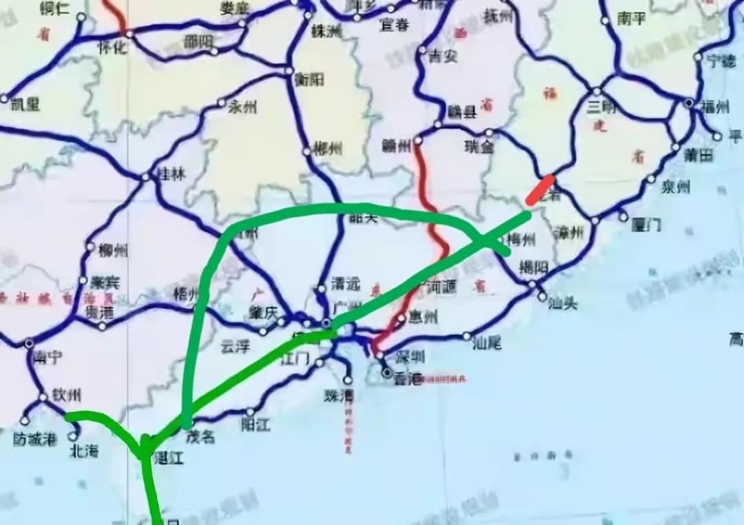 目前茂名市可以沿着深湛铁路到达珠三角各市,也可以到达湛江,但是由于湛江的高铁线路还没有建设完成,所以到了湛江之后就形成了“断头路”,待到所有的高铁线路规划完成后,茂名可以形成4个方向5条高铁的线路,从下图可以看出茂名市的大致高铁方向,注意想看详细的路线要看国家发布的,下图仅仅表示大致方向,不代表实际为位置,想看详细的规划图(蓝色表示已经开通的,红色表示在建设的的,绿色表示规划的)