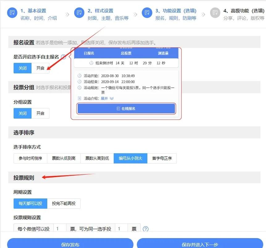 3.制定投票规则,添加人物或作品信息(选手在线报名和主办方后台上传两种方式任选)。
