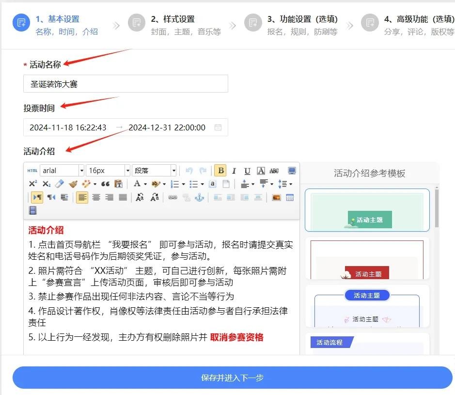 1.输入活动名称、活动介绍,设置投票时间。