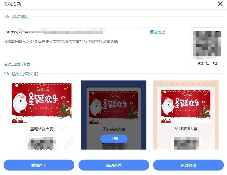 保存并发布活动,投票链接、二维码和海报就会自动生成。