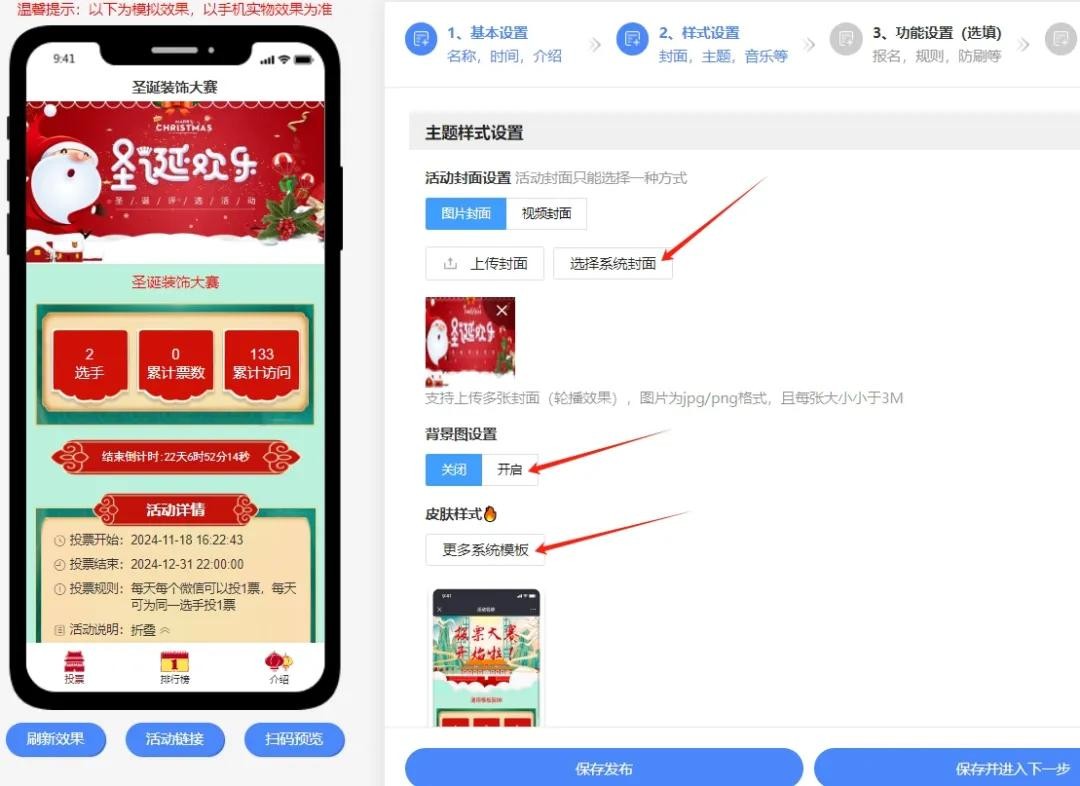 2.设置圣诞主题的活动封面和皮肤样式,还可以添加符合节日氛围的漂浮物和背景音乐。