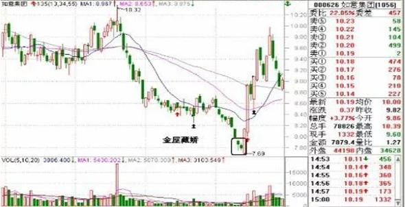 2、次日在下影线里开出小阴或者小阳线,称之为金屋藏娇;