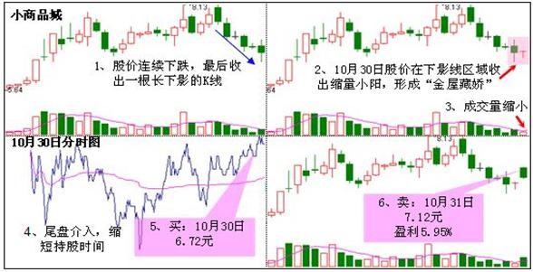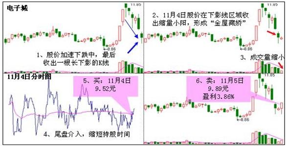 如下图,这是电子城在2013年11月份的走势图,图中显示,该股在11月4日之前,股价是处在加速下跌中,且在11月4日该股收出一根长下影的K线,股价在下影线区域收出缩量小阳,这样就形成了“金屋藏娇”。同时成交量呈现的是缩小的状态,在11月4日的尾盘以9.52元的价位进行买入,在11月5日以9.89元的价位进行卖出。