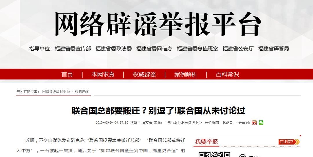 网络辟谣举报平台记者在联合国官方微博上输入“联合国总部搬迁”,未搜到任何相关新闻。这么大的新闻,不应该昭告天下,一起庆祝这天大的好事吗?对以上传言,表示深深的怀疑!
