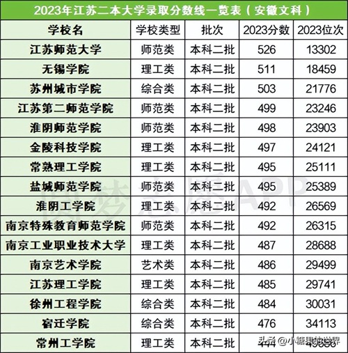 以安徽2023年的招生数据为例,在理科方面,江苏二本院校的录取线在455-505分之间,位次在78185-132453之间;在文科方面,江苏二本院校的录取线在444-526分之间,位次在13302-49686之间。